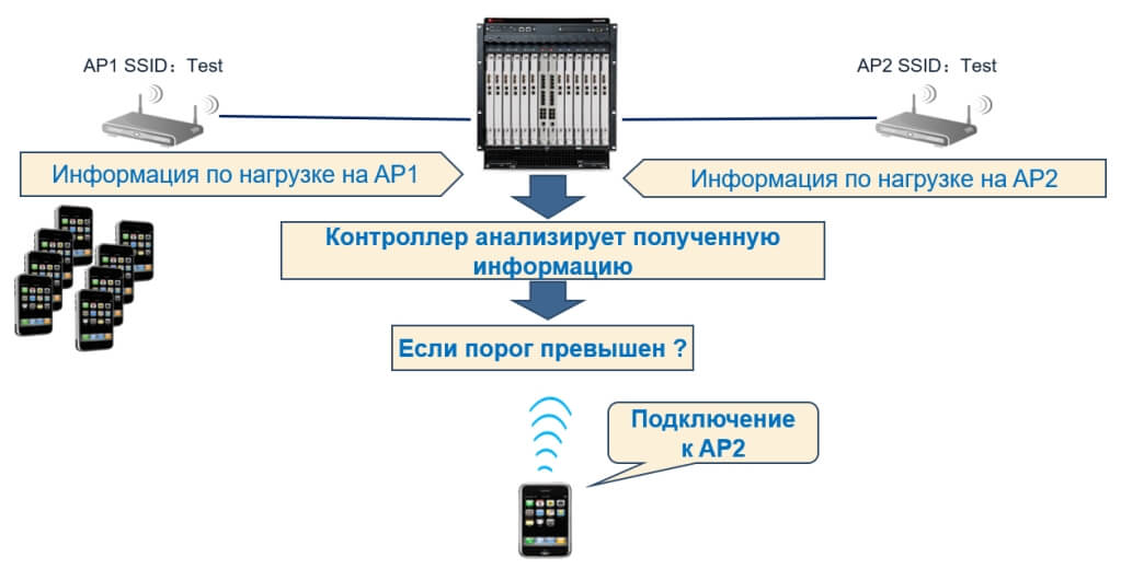 Контроллер переключит абонента с перегруженной точки AP на свободную даже в случае, когда сигнал от перегруженной точки сильнее.