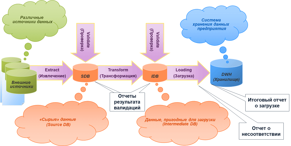 Независимо от особенностей построения и функционирования ETL-система должна обеспечивать выполнение трех основных этапов процесса ETL-процесса: