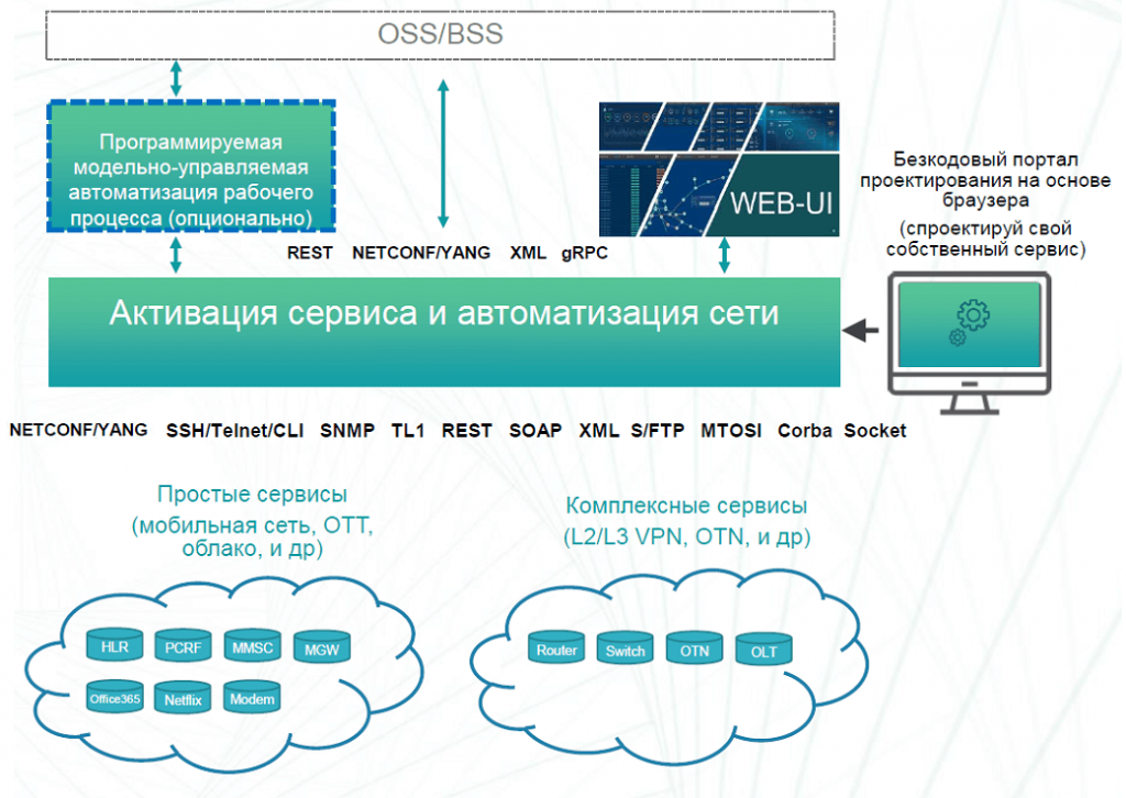 Таким образом, представленный продукт - это интегрированная мультиплатформа, позволяющая динамически отображать и управлять сетью оператора в разрезе оборудования и ресурсов (OSS) и сервисов или услуг для конечных абонентов (BSS). Платформа позволяет управлять конфигурацией и сервисами в режиме CRUD (Create, Read, Update, Delete), а также управлять отказами.